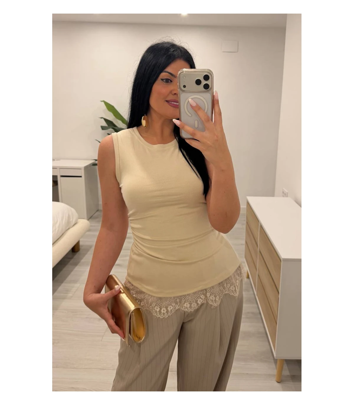 Camiseta algodón encaje camel